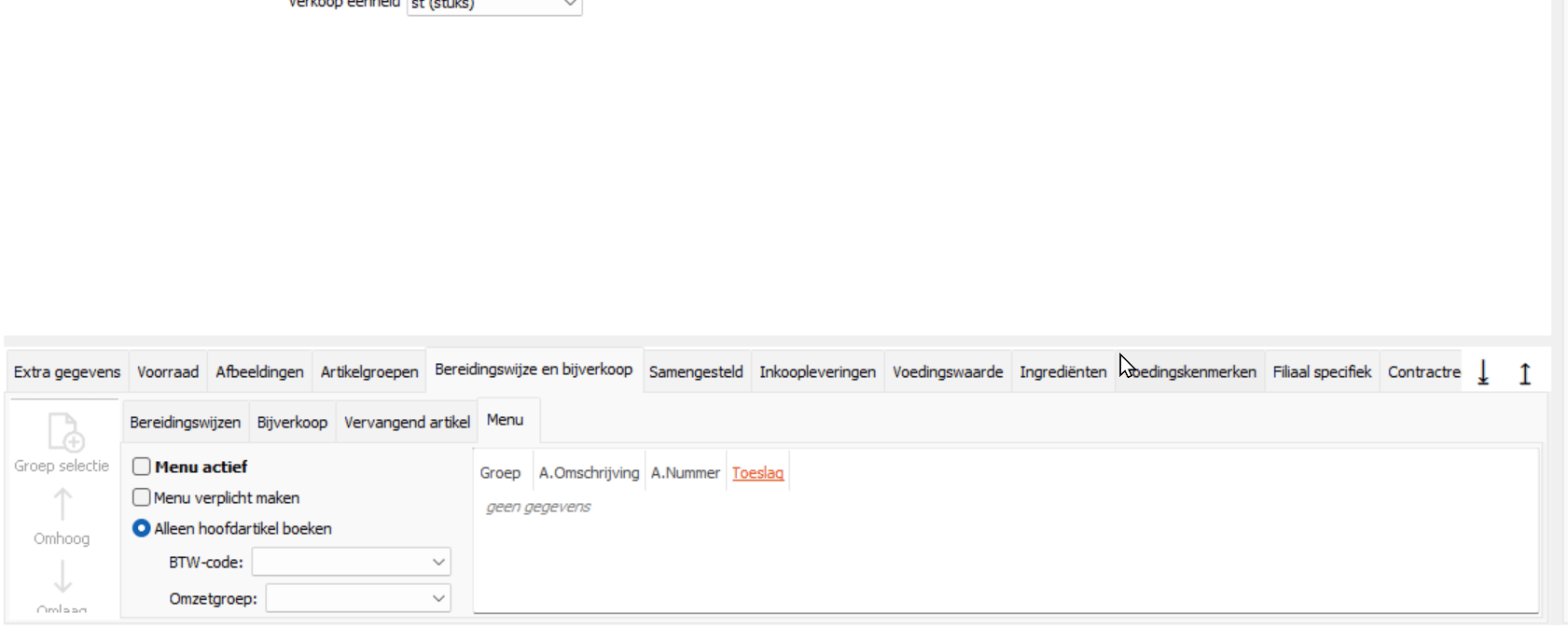 Geef dit artikel een naam (bijvoorbeeld 3 gangen menu) en ga onderin naar het tabblad "Bereidingswijzen & bijverkoop"