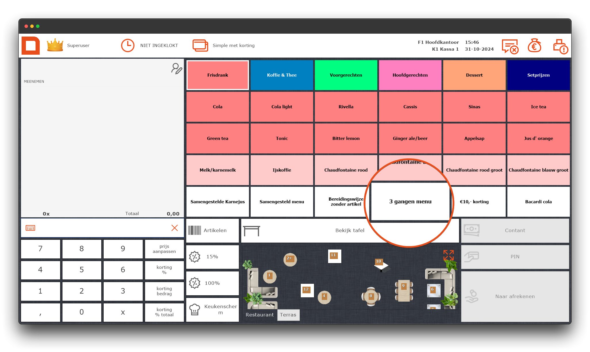 Zet nu dit hoofdartikel (3 gangen menu) óf de individuele gangen op de snelknoppen.