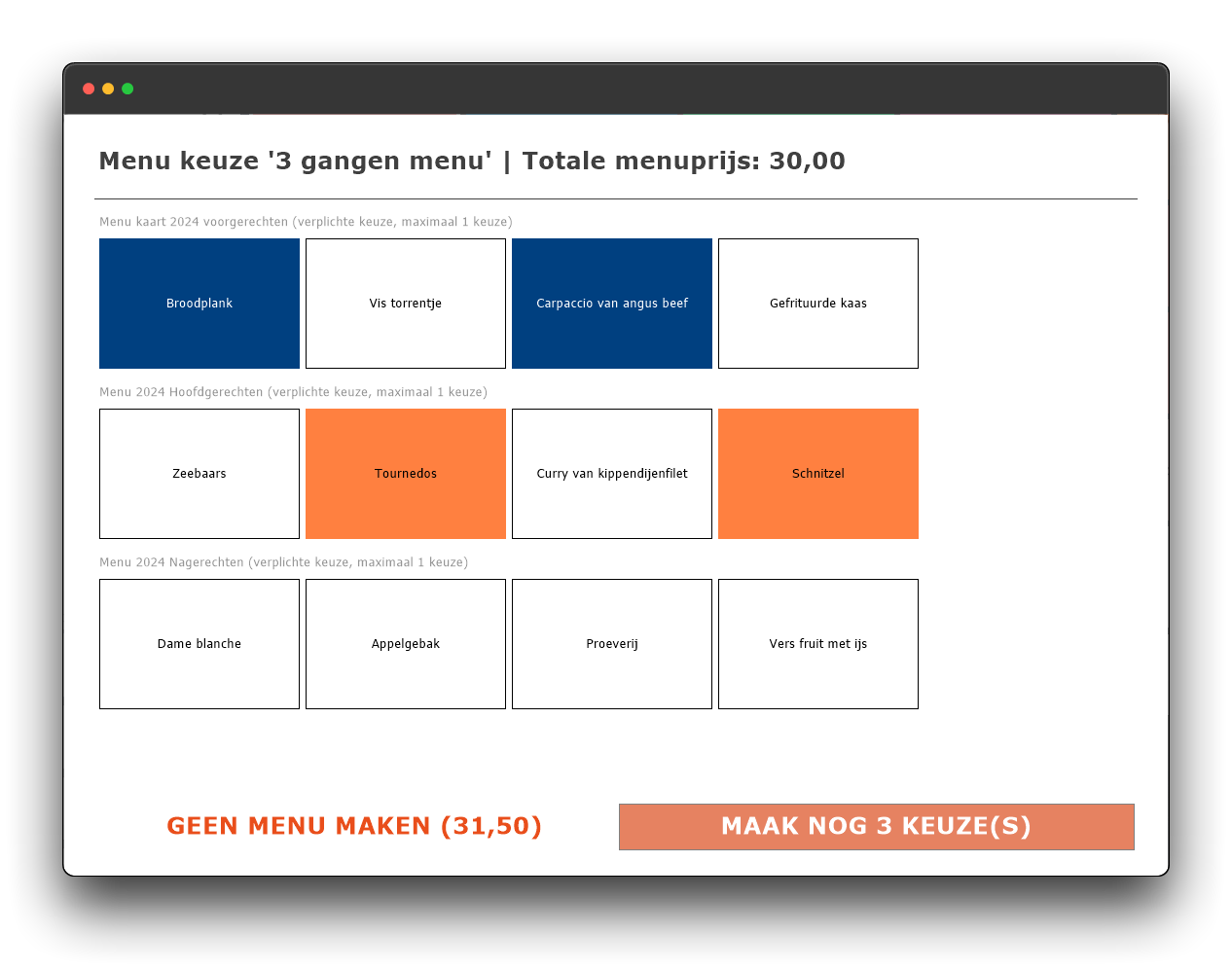 Zet nu dit hoofdartikel (3 gangen menu) óf de individuele gangen op de snelknoppen.