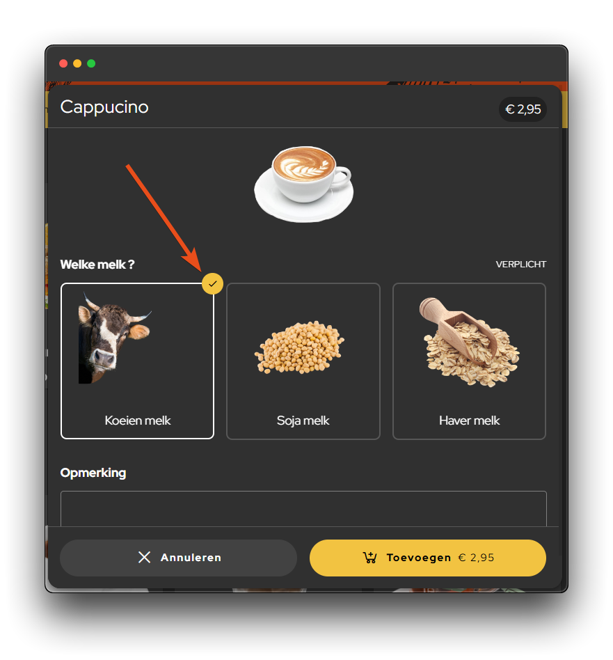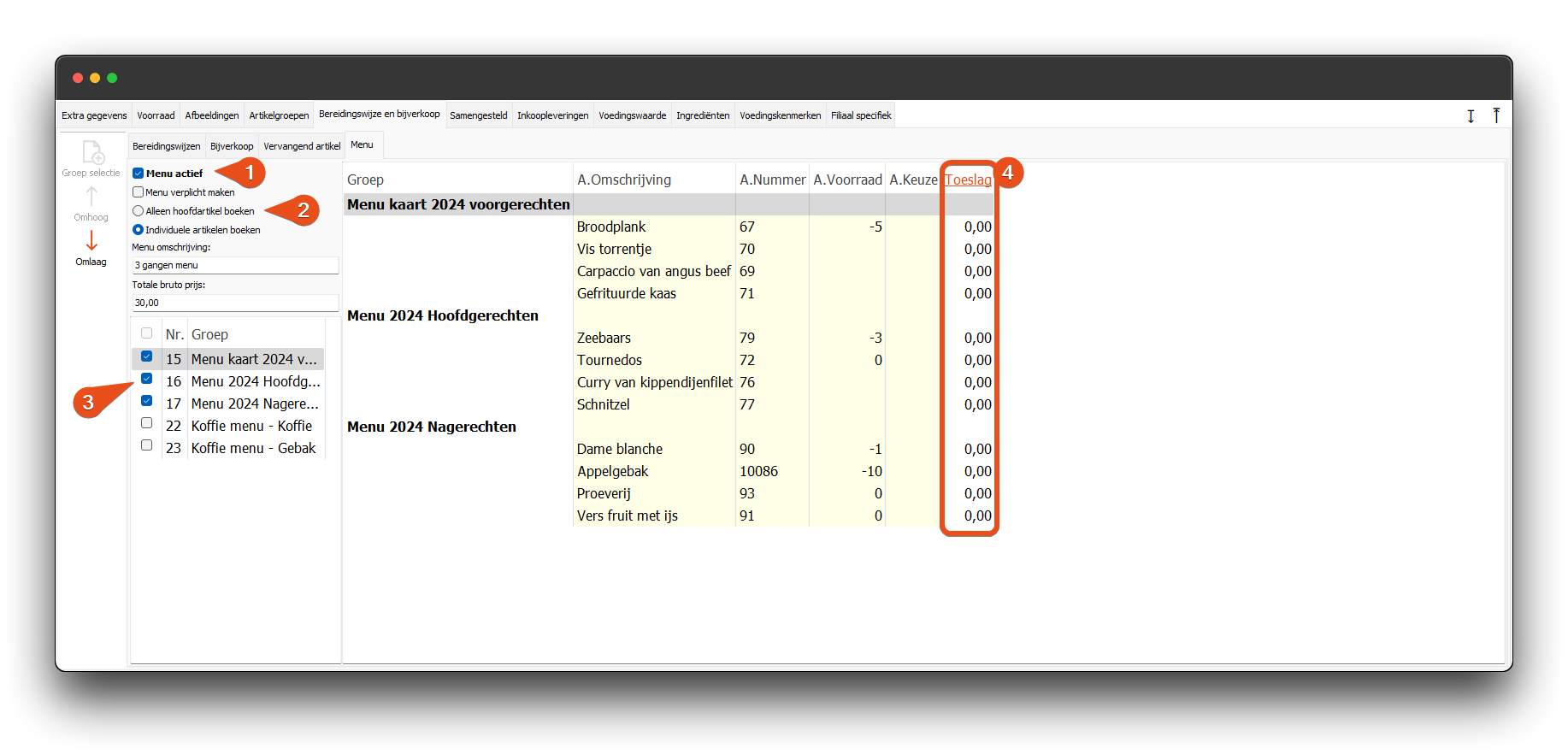 - Ook kun je nog een toeslag invullen. Bijvoorbeeld voor een biefstuk die €2,- duurder is. (4)